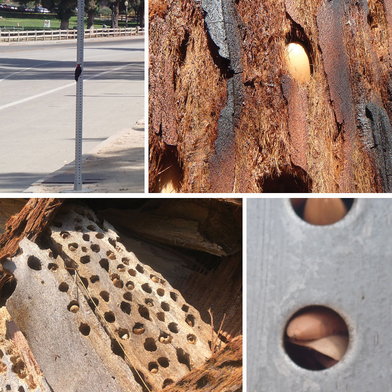 Wildlife in an urban environment must adapt in order to survive and the modern thinking woodpeckers of Griffith Park have abandoned the wooden granary and replaced them with steel cages which offer better protection for their valuable food. But what of dispersing oak seeds for future generations?