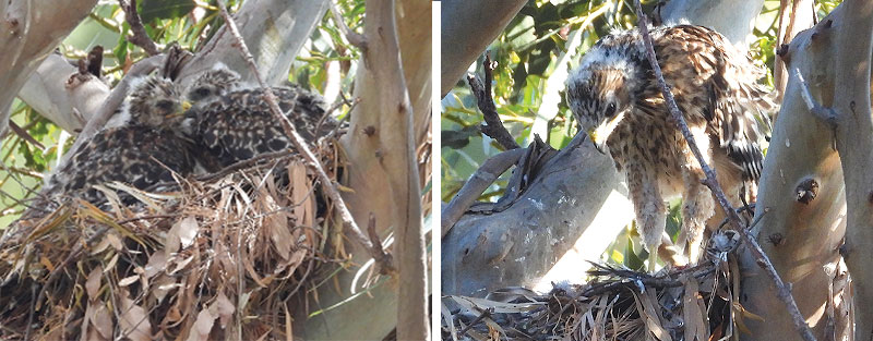A red-shouldered hawk pair (RSHA-561) was raising a family in a park-adjacent hillside neighborhood. They settled into their newly-built nest in a eucalyptus tree very close to the tree where they had nested the previous year. Two chicks hatched in mid-May, and the parents worked together to bring them food and watch over them. Parent hawks share nest-sitting and hunting duties, more or less, without gender bias.