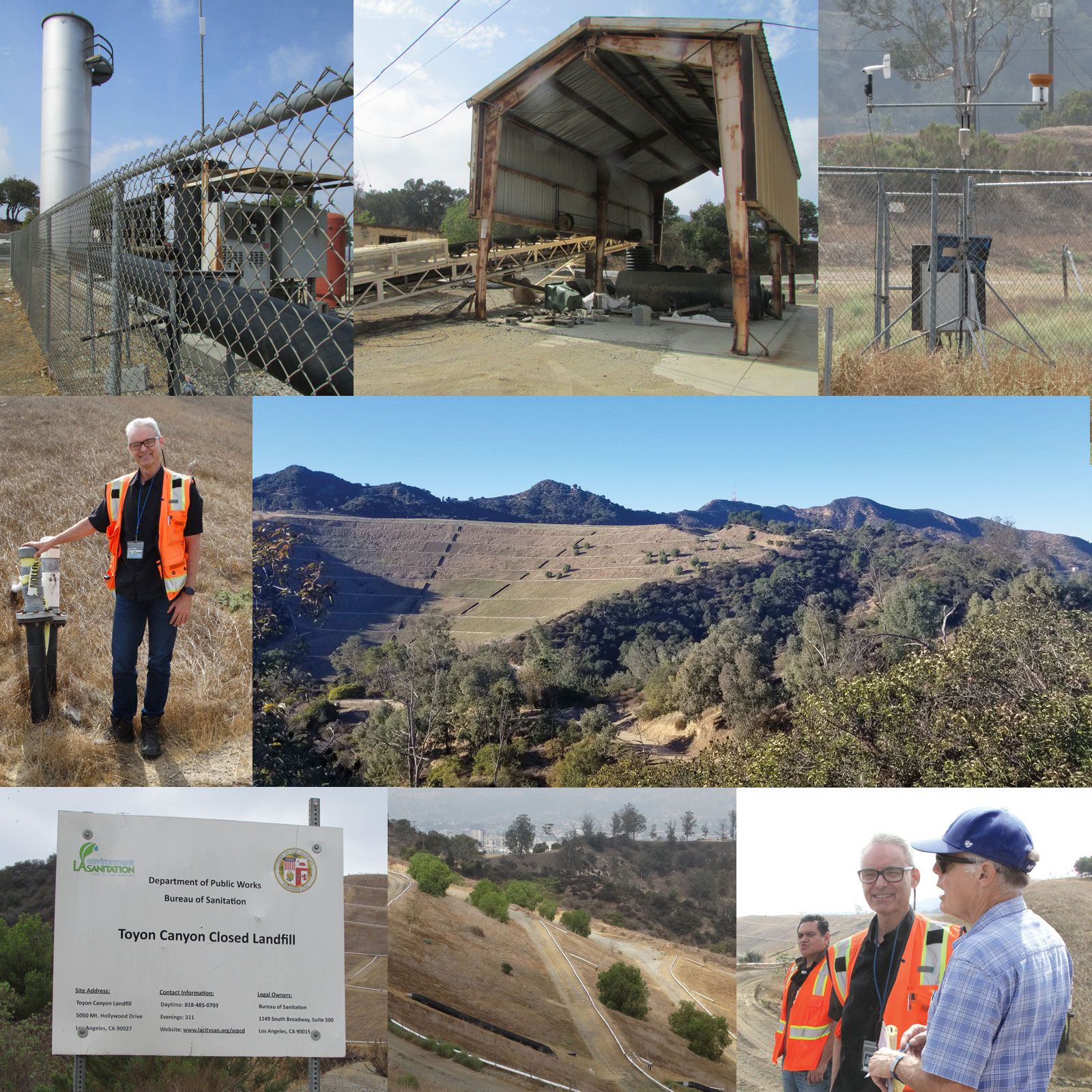 Bottom/left: Signage announces the Toyon Landfill is permanently closed. Center: Despite the monofill which is supposed to deter trees from propogating in the landfill, pepper trees continue to emerge. Right: Author Mike Eberts discusses the history of Toyon Canyon and its future plans with LA Bureau Sanitation employees John Hamilton (center) and Miguel Zermano (left)