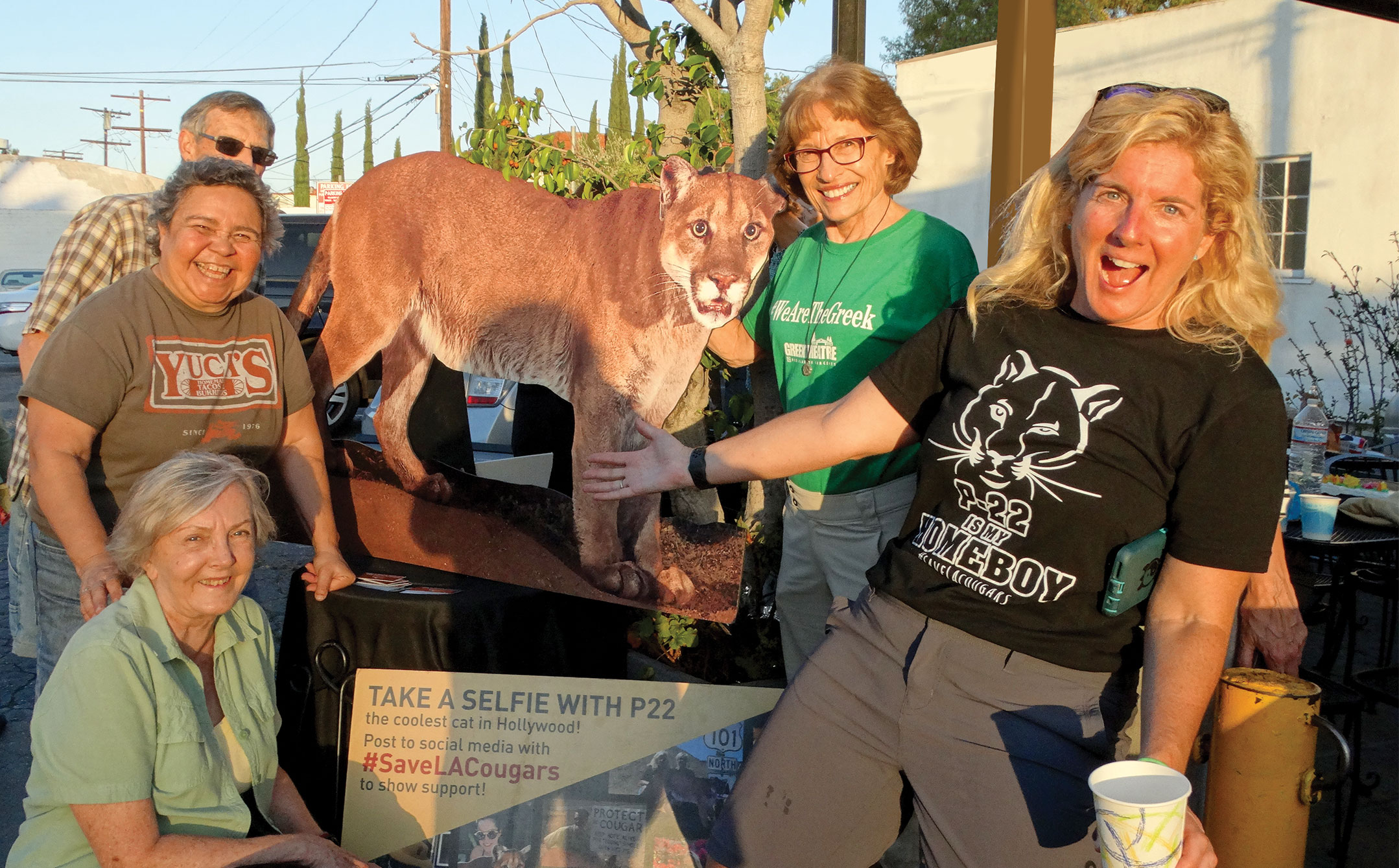 Photo/top: P-22 Day celebrations included a stop at Yuca’s on Hillhurst and an invite to take a P-22 selfie. Dora and Beth were joined by FoGP’s Marian Dodge, Steve Dodge and Mary Proteau (in front)