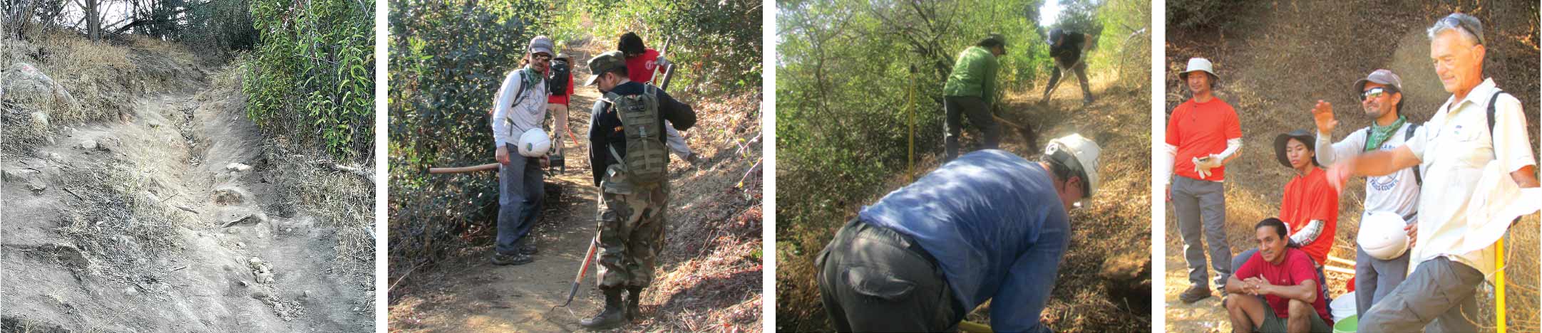 Photo, top: the Pulaski used along the trail combines an axe bit with an adze-shaped grub hoe. This tool was very important to the restoration as it’s effective in root-bound or hard soil. The trail erosion can clearly be seen in the photo. While volunteers have made great strides in this project, the effort is still ongoing. Bottom, left: prior to restoration, portions of the trail were badly eroded, unstable and dangerous for trail runners and hikers. Several groups that pitched in to help with the restoration included Boy Scouts.