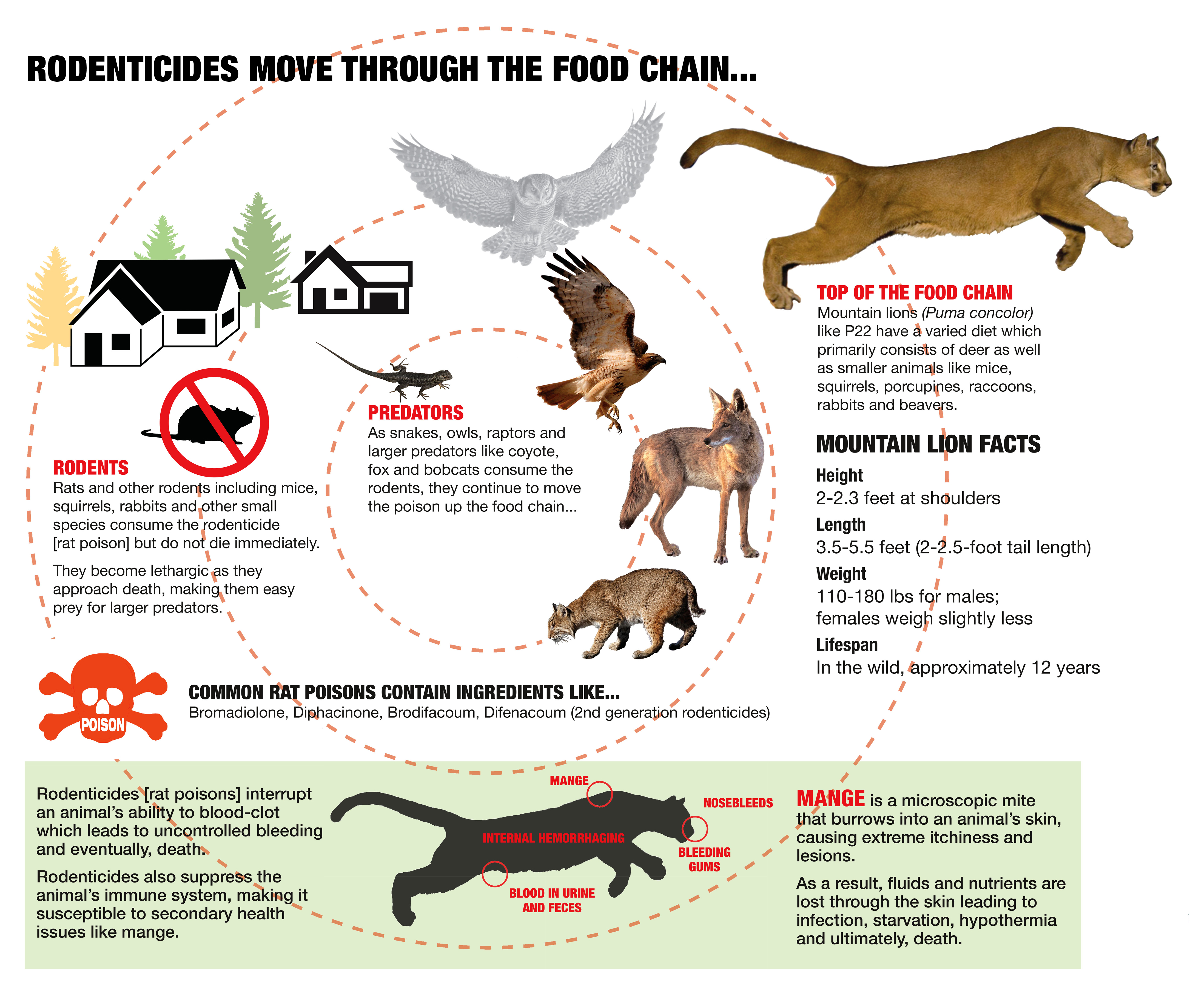 • Rodenticides (rat poisons) designed to kill rodents are poisoning California’s native wildlife. Rodenticides are consumed by rats, who in turn are consumed by other wildlife, resulting in secondary poisoning and contamination of the food chain. Rodenticide poisoning is widespread. A recent analysis of 11 studies found that more than 85% of California mountain lions, bobcats, and Pacific fishers have been exposed to these dangerous poisons.