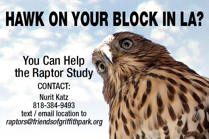 Sponsored by Friends of Griffith Park and in partnership with the Resource Conservation District of the Santa Monica Mountains, the Los Angeles Raptor Study engages volunteers all across Los Angeles to monitor raptor nests (hawks, owls, and falcons) during spring and summer to learn how these birds are adapting to the urban environment.