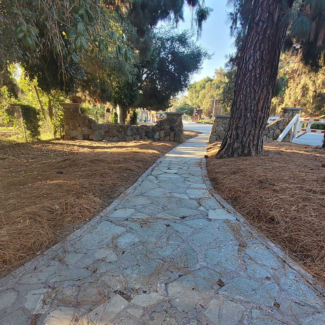 2.Cross Los Feliz Blvd. and continue straight. At .15, walk down the stone stairway on your L to enter the Griffith Park Recreation Center grounds. Pass the playground and nursery school on the L. Turn L at the water fountain to walk forward and peek at the currently-empty “Plunge” pool, which opened in 1927 and originally featured aquatic versions of the Rose Parade.
