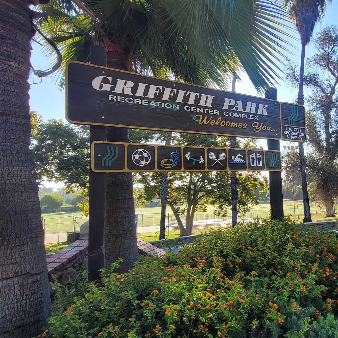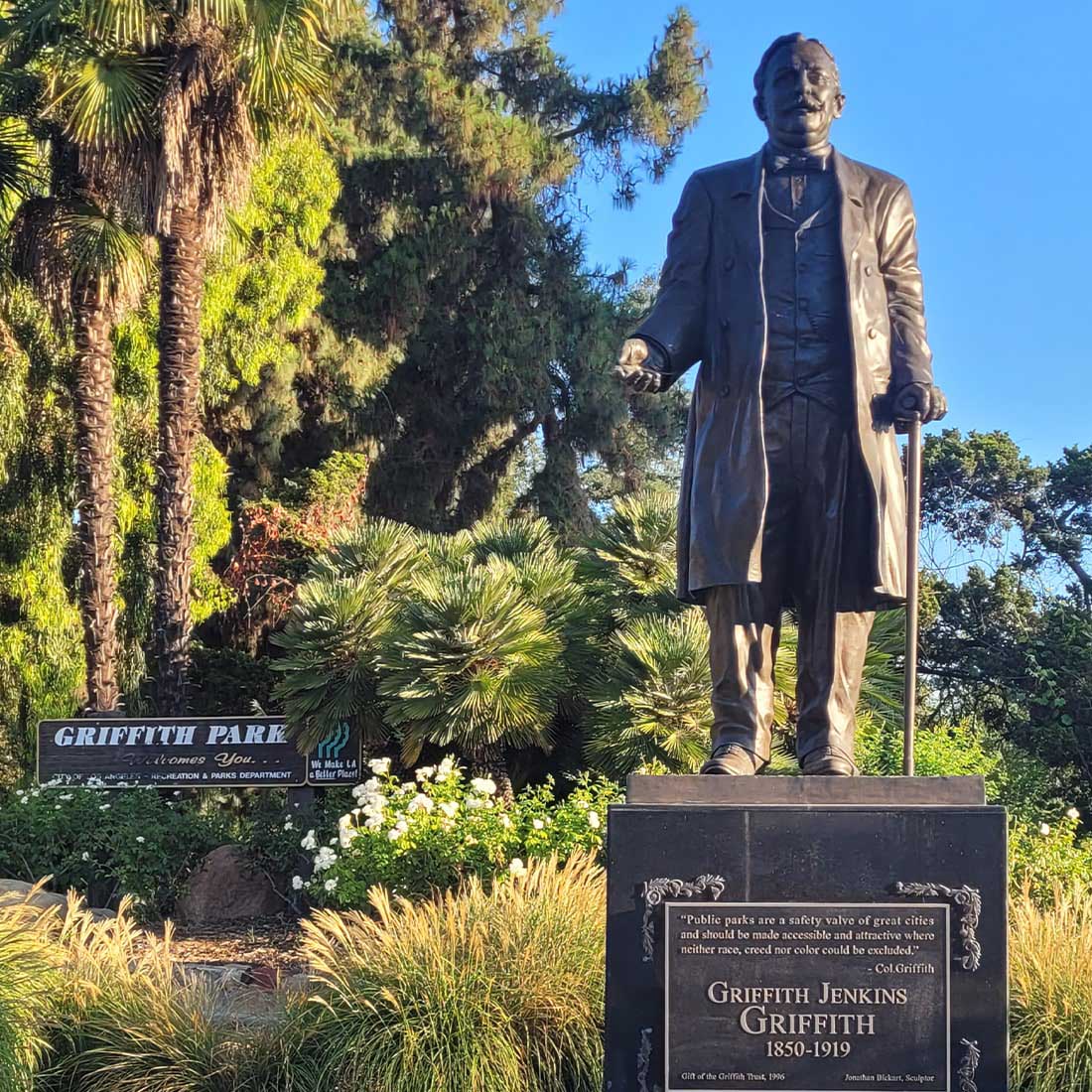 1.Walk S toward Los Feliz along a pretty paver-ed sidewalk. You’ll also pass the #296 bus Metro stop, a convenient transport through the Park and to Burbank. Pause at the statue of Col. Griffith at the corner to give thanks for the 3,000+ acres he donated in 1896 to all citizens of Los Angeles to enjoy.